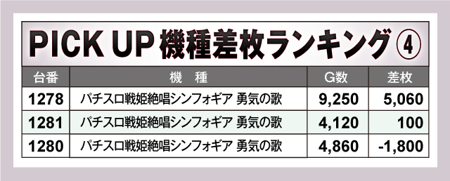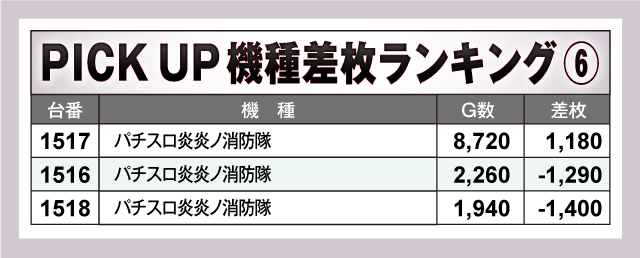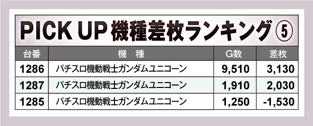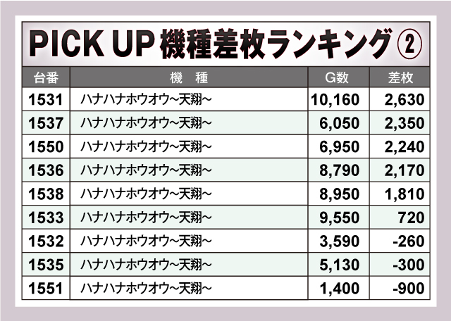 続いては、当日店内を大いに盛り上げた6機種をチェック。6機種全てから良台が出現していたが、とくに注目して欲しいのは「ハナハナホウオウ~天翔~」の盛り上がり。ノーマルタイプながら差枚ランキングに5/19台ランクインしており、ピックアップ9台のうち5台が差枚+1,000枚超えと上々の結果をマーク! その他の機種も素晴らしく、もちろんこれら6機種以外からも良台はアチコチに出現していた!