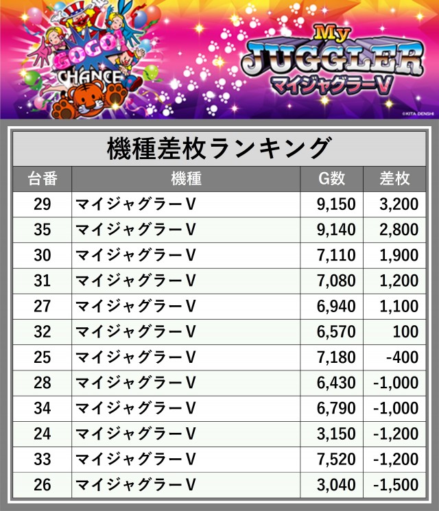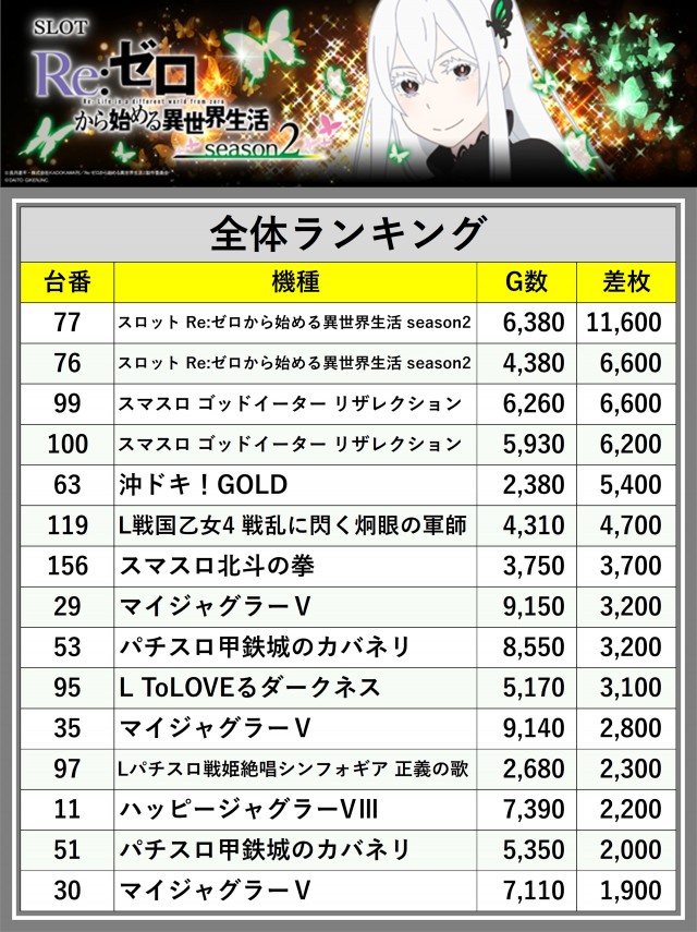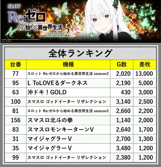 厳選された取材対象機種をはじめ、その他スロット全体から好記録が飛び出した!プレイヤーが楽しんだ1日を下記データにて振り返ってみて欲しい。