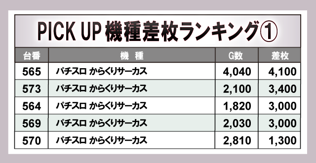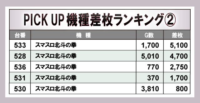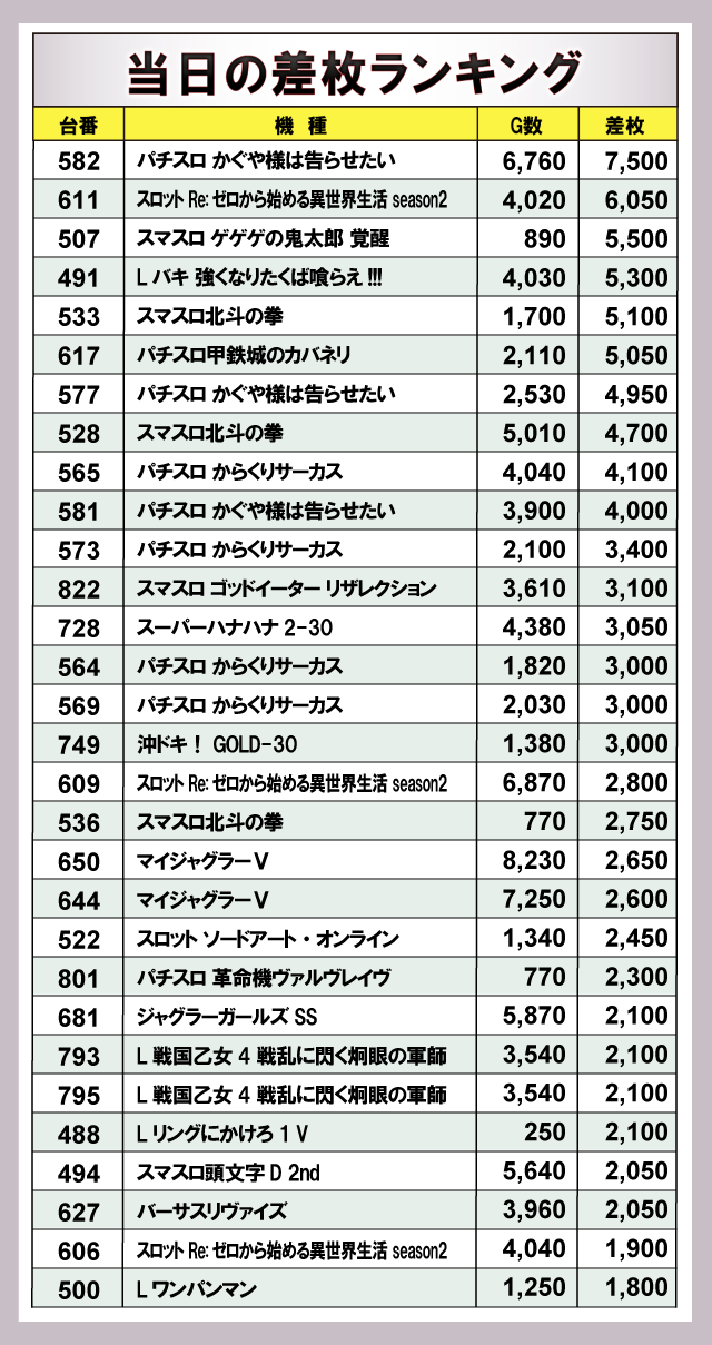 当日、特に盛り上がっていたのが上表の3機種だ。『パチスロ からくりサーカス』『スマスロ北斗の拳』『沖ドキ!GOLD-30』の3機種は好成績をマークしており、コンスタントな当選でファンにとって叩き甲斐のある状況だったに違いない。
