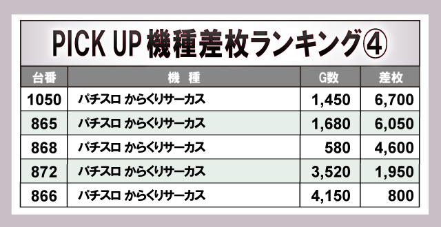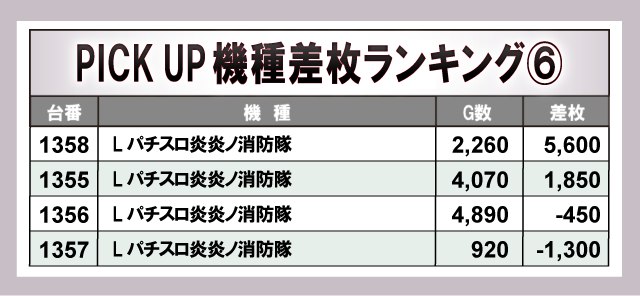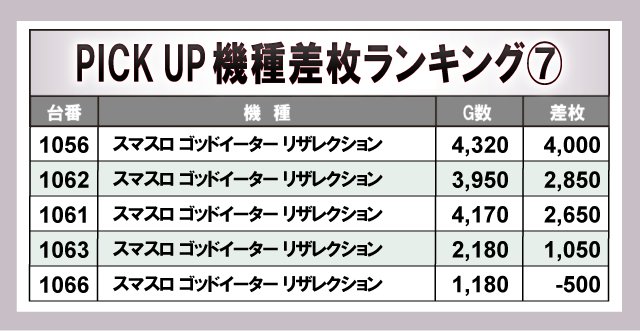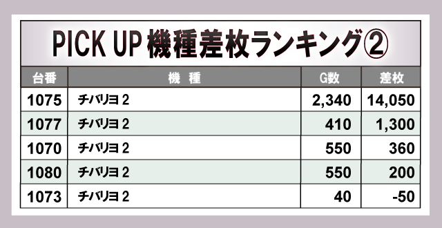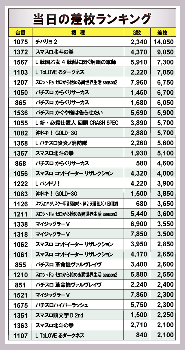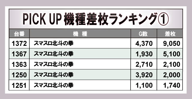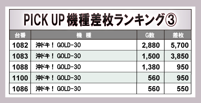 『チバリヨ2』から14,050枚という驚きの数字が打ち立てられ、店内の盛り上がりを大きくリードしていた。これに『スマスロ北斗の拳』なども続いているが、それでも追随を許さないほどの熱気が放たれていたと言えよう。新台『L新・必殺仕置人 回胴 CRASH SPEC』『Lバンドリ!』もさっそく名を連ねており、今後の活躍が期待されるばかり。
