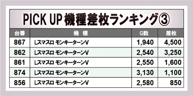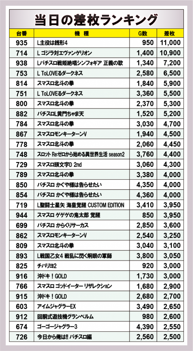 上表の優秀機種たちは、いずれもファンが手応えを感じていた様子が窺える。不動の人気機種『スマスロ北斗の拳』が複数の4桁OVER台が発生する活躍をみせる傍ら、しっかりとメダル機の『ゴーゴージャグラー3』『沖ドキ!GOLD』にも順調に大当りを積み重ねている台が確認できた。店内には各所から熱気が放たれており、ファンにとっては笑顔が溢れる1日になったのは間違いないだろう。