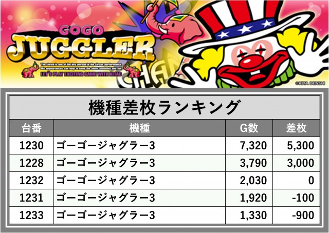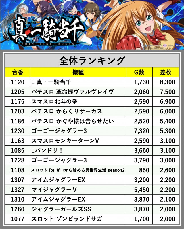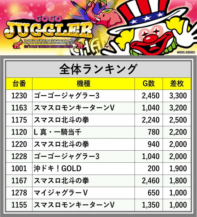 厳選された取材対象機種をはじめ、その他スロット全体から好記録が飛び出した!プレイヤーが楽しんだ1日を下記データにて振り返ってみて欲しい。