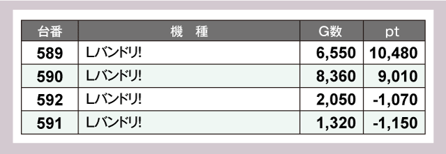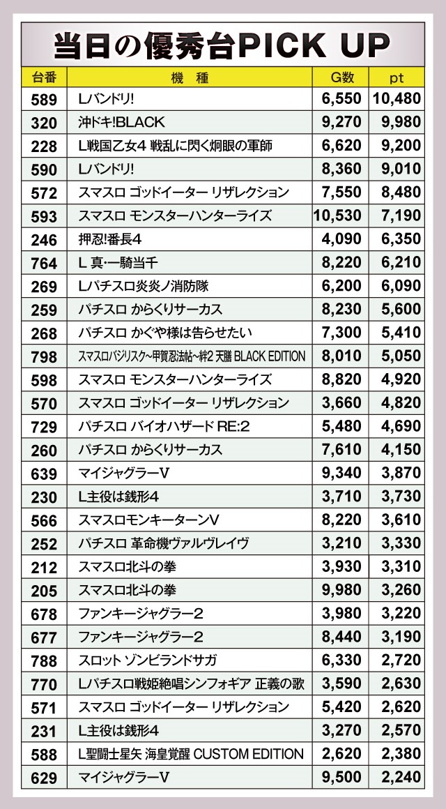 この日は589番台『Lバンドリ!』が1万ptオーバーを達成!さらに320番台『沖ドキ!BLACK』や228番台『L戦国乙女4 戦乱に閃く炯眼の軍師』も+9,000ptオーバーと素晴らしい結果を残している。