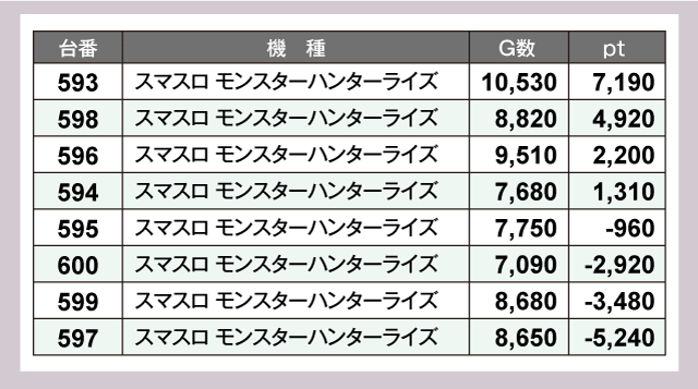 『スマスロ モンスターハンターライズ』では593番台が+7,190pt、598番台が+4,920ptと見事な活躍を見せていた。