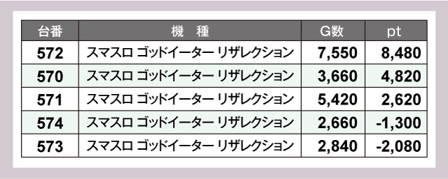 『スマスロ ゴッドイーター リザレクション』は3台がランクイン。572番台が+8,480ptと素晴らしい記録を残している。