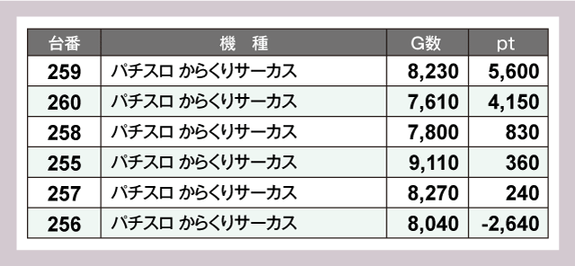 さらに『パチスロ からくりサーカス』は平均8,000G超えと高稼働。259番台の+5,600ptや260番台の+4,150ptなど好記録をマークした。