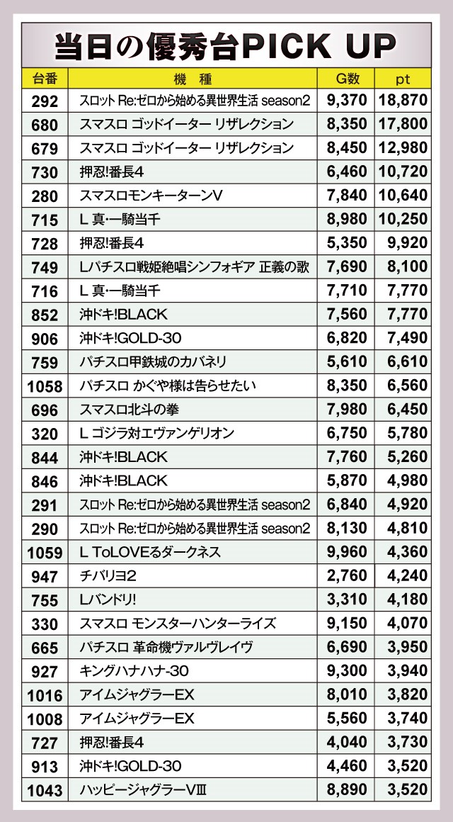 この日は292番台、680番台、679番台、730番台、280番台、715番台が1万ptオーバーを達成!なかでも『スロット Re:ゼロから始める異世界生活 season2』は+18,870pt、『スマスロ ゴッドイーター リザレクション』は+17,800ptと驚異のptを叩き出している。