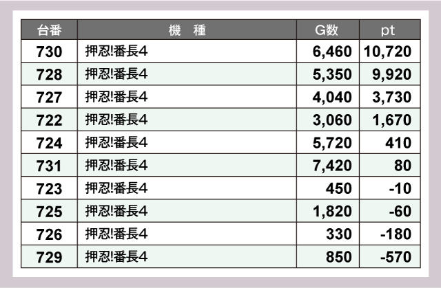 まず注目したのはランキング上位に食い込んだ『押忍!番長4』、730番台の1万ptオーバーを筆頭に、728番台+9,920ptなどあちこちで活気あるシーンを目にしている。