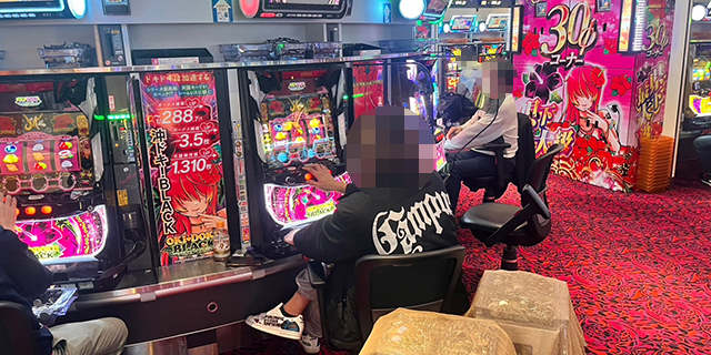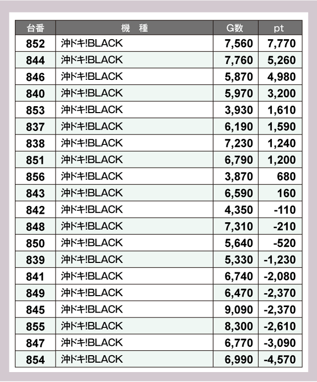 続いてはメイン機種の『沖ドキ!BLACK』。半数がプラスで、852番台は+7,000ptオーバーとポテンシャルを発揮し周囲の視線を集めていた。