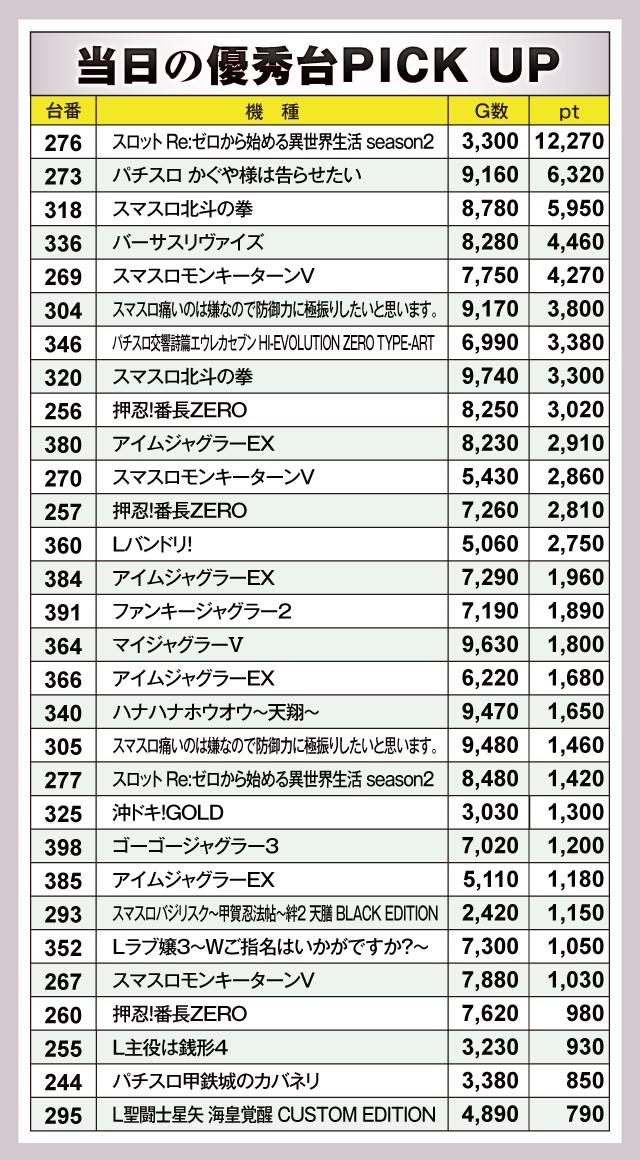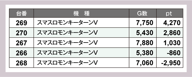 ピックアップ機種を見てみると、『スマスロモンキーターンV』では、269番台の+4,270pt、270番台+2,860ptと実に華やかな光景が広がっていた。