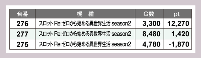 『スロット Re:ゼロから始める異世界生活 season2』は276番台が+12,270ptと誰もが羨む理想的な展開を迎えており、周囲の視線を集めていた。