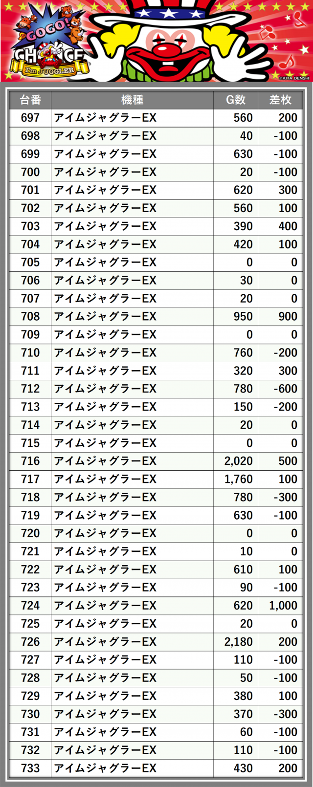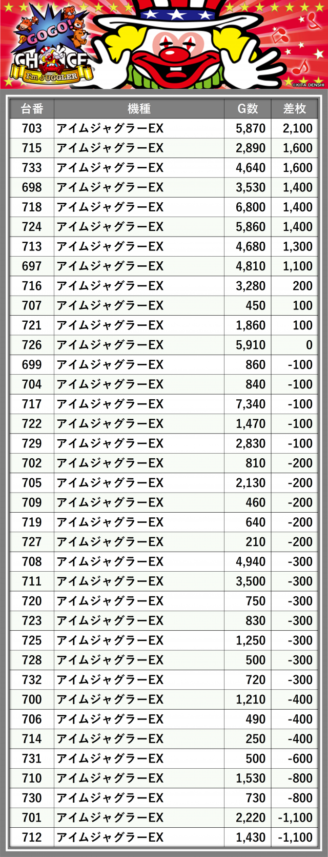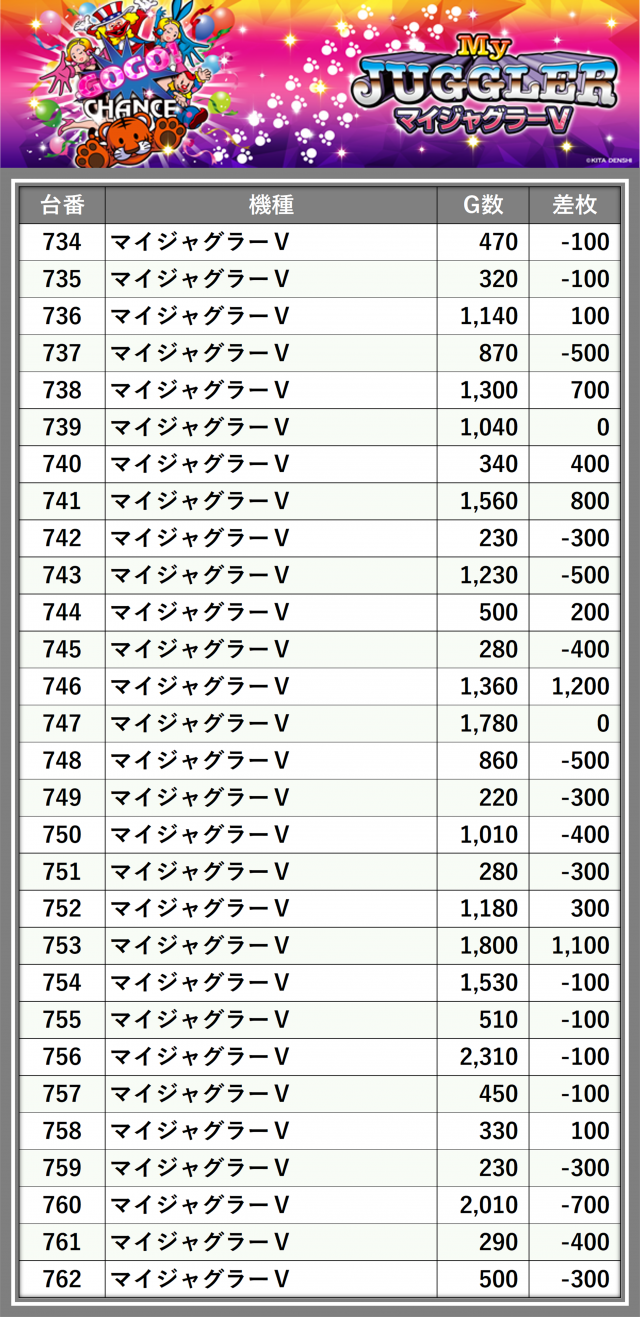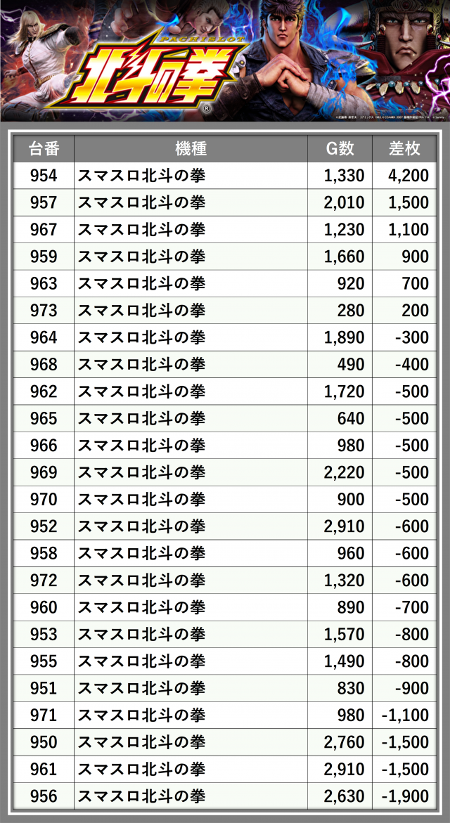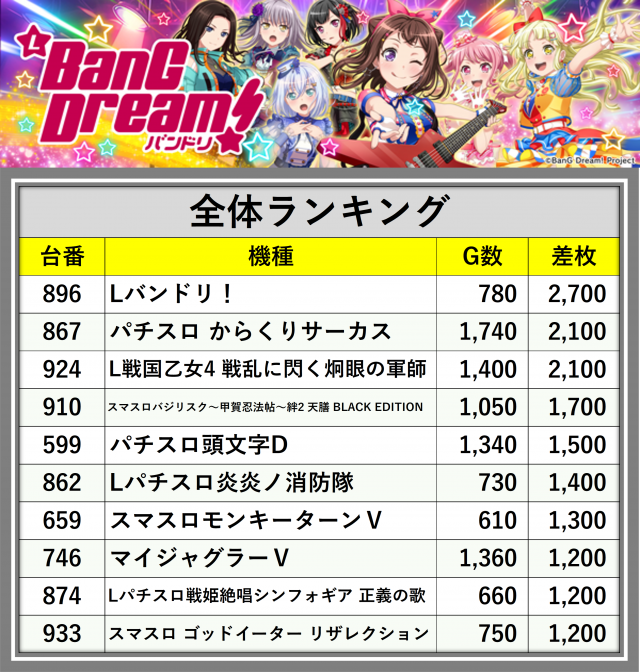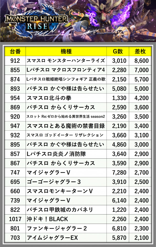 ※差枚数順に掲載しています