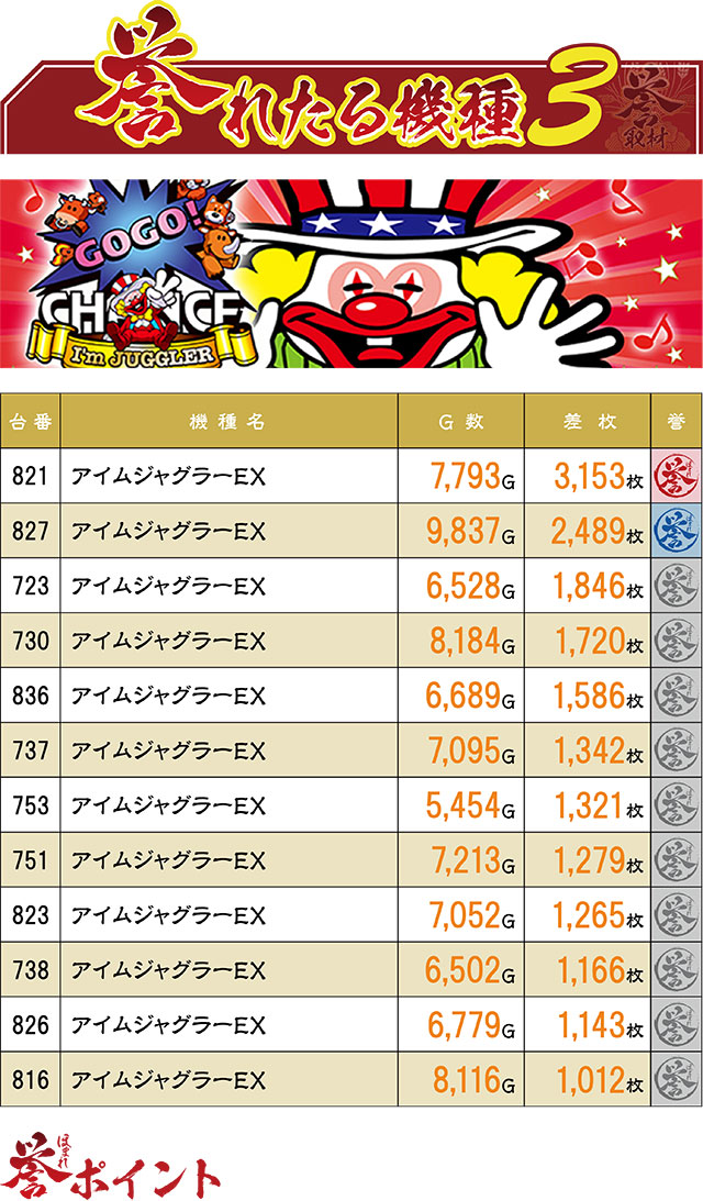 勝率63%という文句なしの結果だったのは40台設置の『アイムジャグラーEX』。計25台がプラスだったわけだが、さらにそのうちの約半数にあたる12台が誉レコードに。残念ながら赤誉と青誉マーク(=2,000枚以上)はそれぞれ1台にとどまったが、環境自体は良好だったようだ。