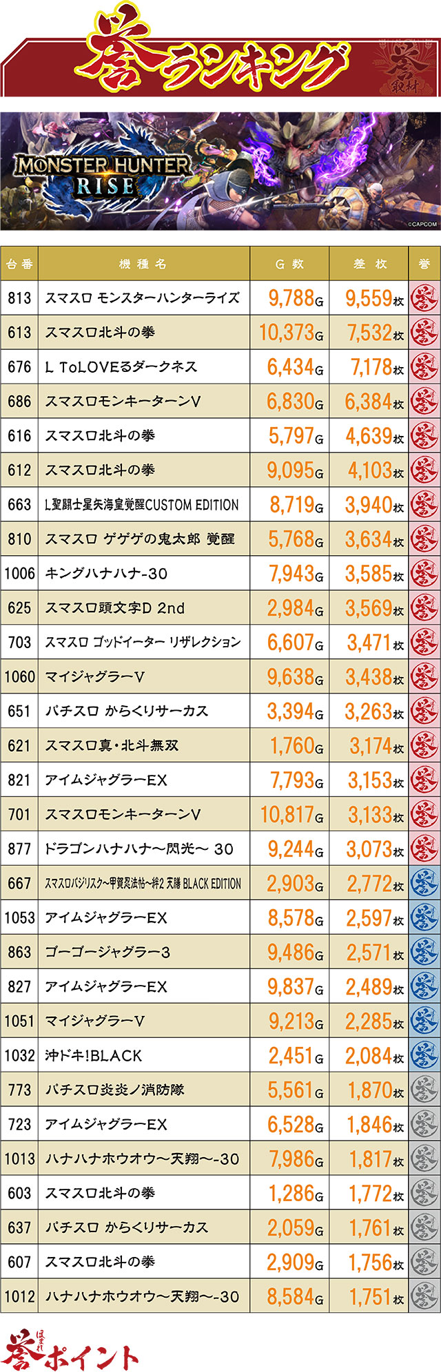新台の『スマスロ モンスターハンターライズ』がさっそく怒涛の9,500枚オーバーを達成!ポテンシャルの高さをまざまざと見せつける結果となった。また2位・3位の記録も7,000枚を超える数値となっており、満足のいくランキングに。