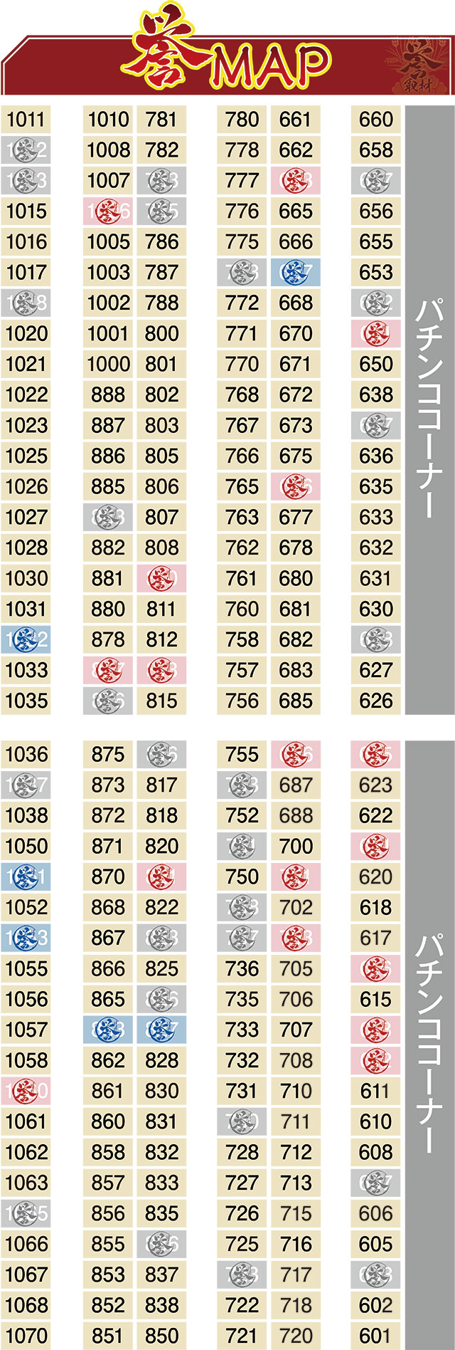 半数以上の台がプラっていた『スマスロ北斗の拳』コーナーの中で、5台が誉マーキングに。最も勢いづき、最も過激に突き進んでいた613番台が7,500枚超えを達成した。また616&612番台も揃って4,000枚超えを実現するなど、『北斗』にはチャンスが多かったことがうかがえた。