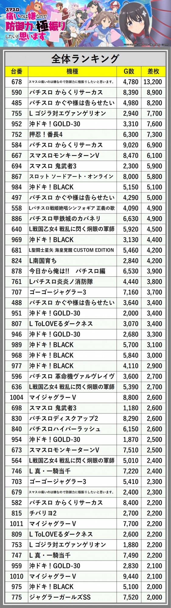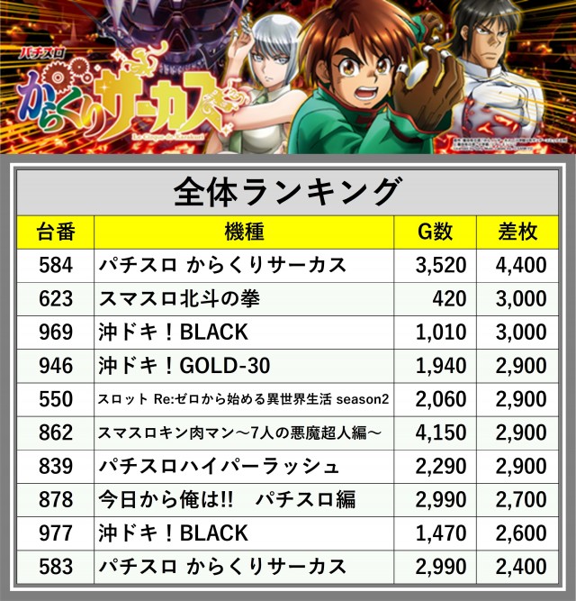 厳選された取材対象機種をはじめ、その他スロット全体から好記録が飛び出した!プレイヤーが楽しんだ1日を下記データにて振り返ってみて欲しい。