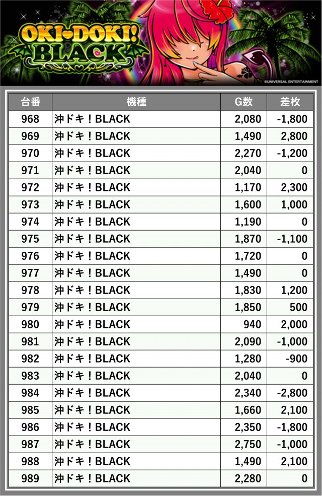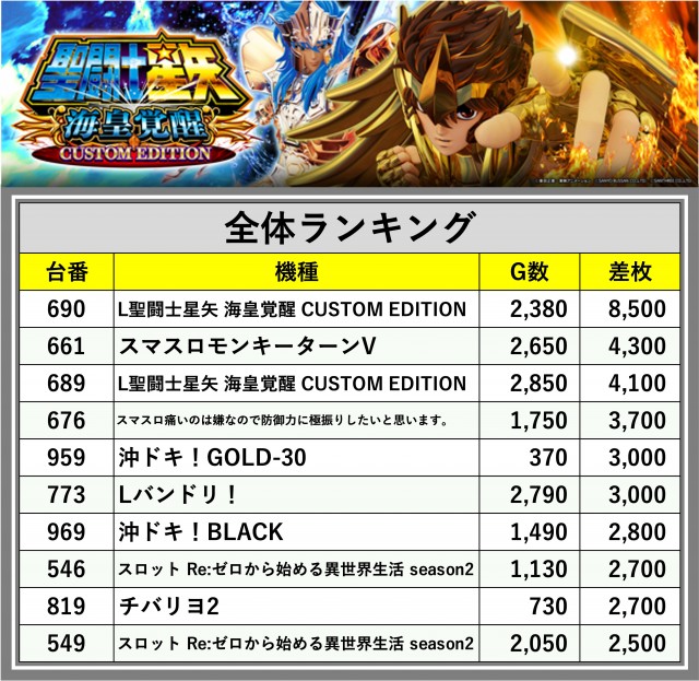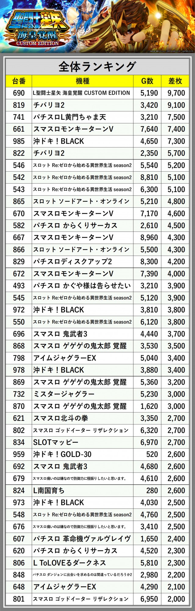 厳選された取材対象機種をはじめ、その他スロット全体から好記録が飛び出した!プレイヤーが楽しんだ1日を下記データにて振り返ってみて欲しい。