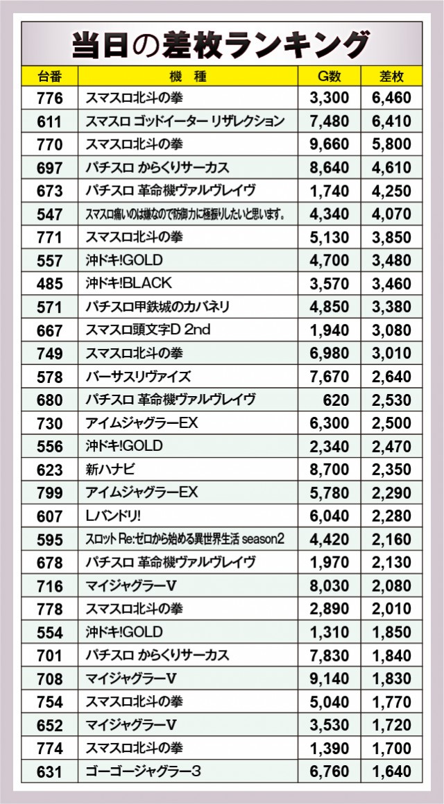 当日は『スマスロ北斗の拳』『スマスロ ゴッドイーター リザレクション』から6,000枚OVERという大台突破台を確認できる。他にもまとまった出玉を確保する台が見られ、注目すべきは終日を通して打ち込まれた台が存在することだろう。ファンが手応えを感じてレバーオンに力が入っていた様子が顕著で、満足度の高い1日を過ごせたようだ。
