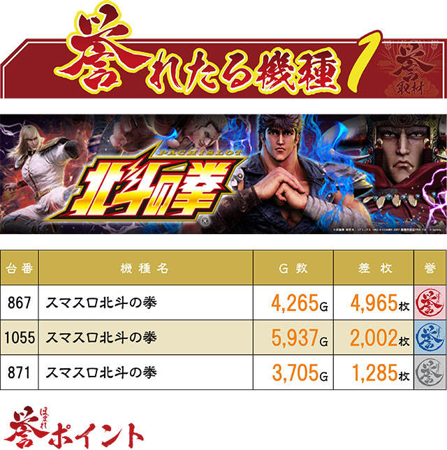 前回も誉レコードを量産していた『スマスロ北斗の拳』からは、3台の誉マークが出現。その中で最も好調の兆しを見せていたのが867番台で、終わってみれば5,000枚に迫る好結果を樹立することに成功した。