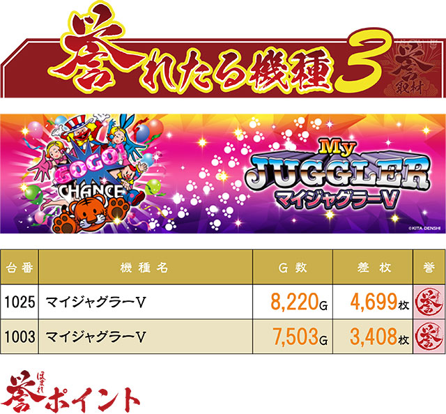 AT機顔負けの結果が飛び出したのは『マイジャグラーⅤ』。2台が赤誉マークという素晴らしい結果を残し、その存在感を存分にアピール。やはり今回も『マイジャグ』にはチャンスが多かったのだろうか。