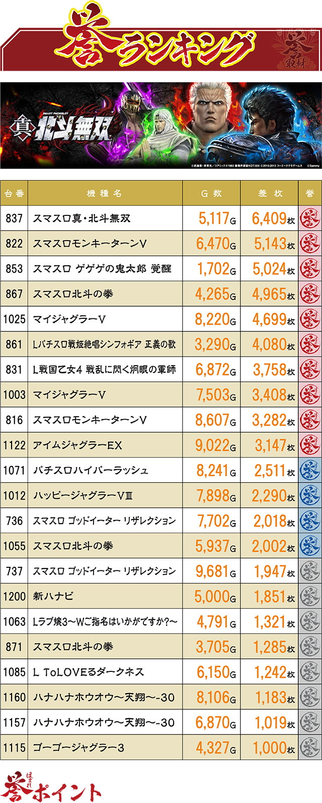 今回の誉ランキングにて、1位記録となったのは『スマスロ真・北斗無双』。その記録は6,000枚を上回っていたものの、もう少し伸びてほしかったのが正直なところ。その鬱憤を晴らすかのように、Aタイプ機種から良結果が続々とランクイン!