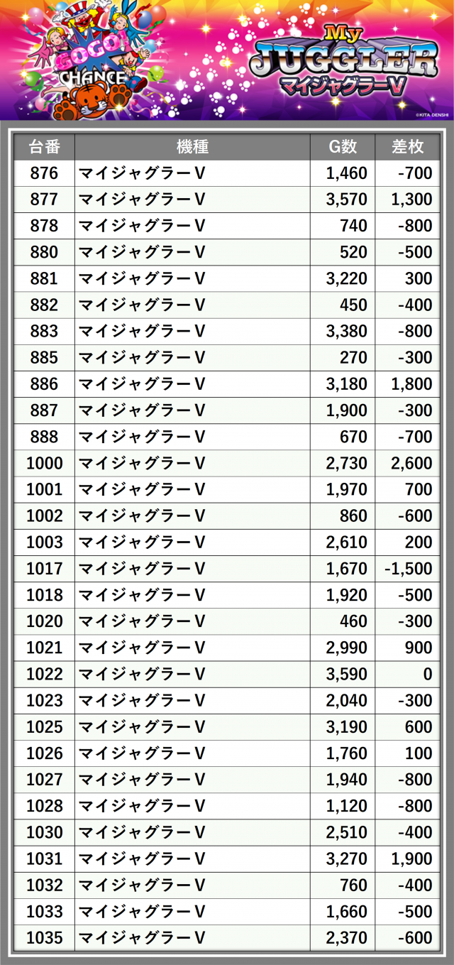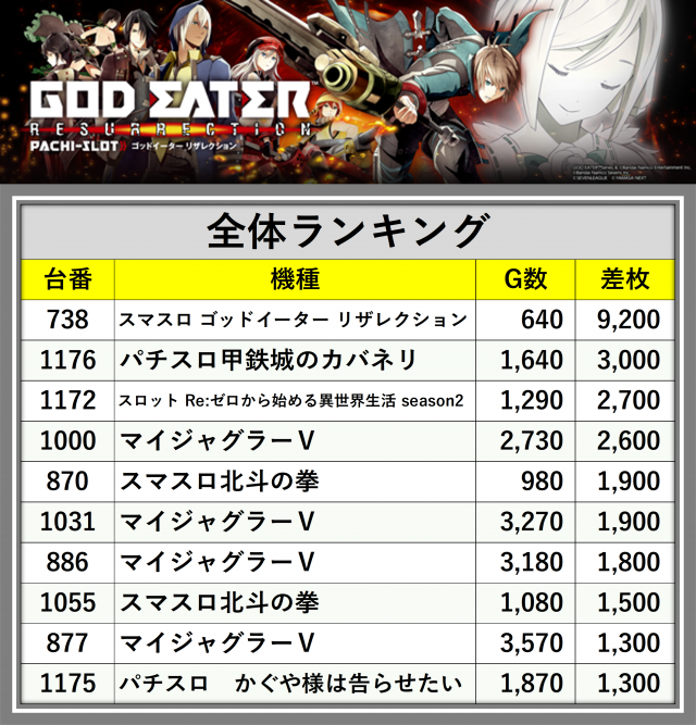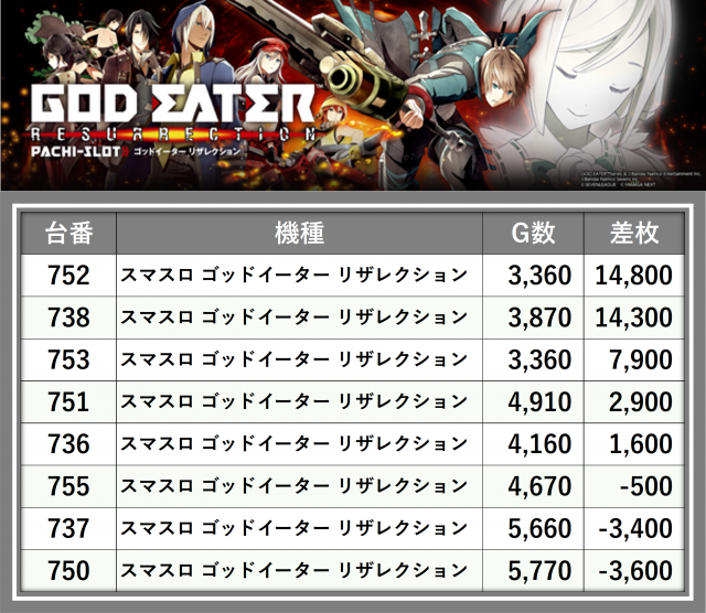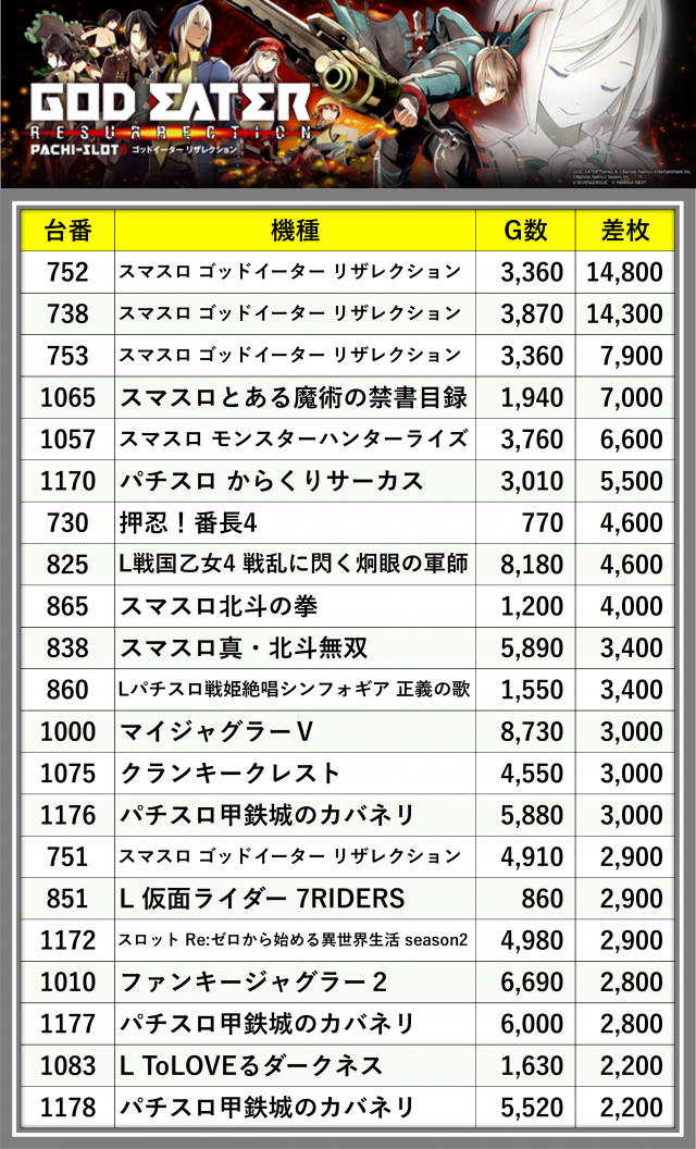 厳選された取材対象機種をはじめ、その他スロット全体から好記録が飛び出した!プレイヤーが楽しんだ1日を下記データにて振り返ってみて欲しい。