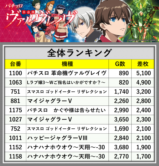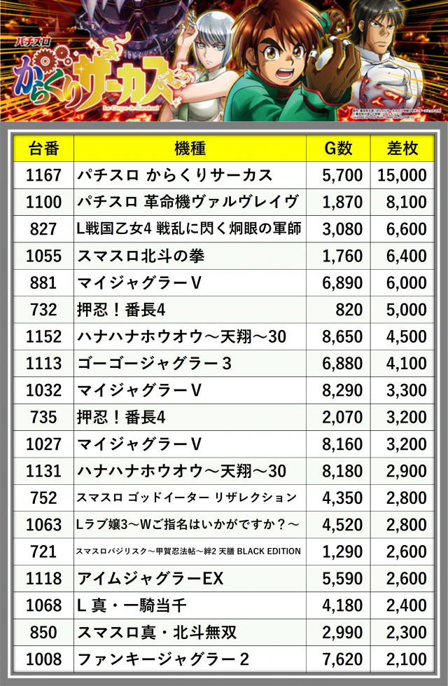 厳選された取材対象機種をはじめ、その他スロット全体から好記録が飛び出した!プレイヤーが楽しんだ1日を下記データにて振り返ってみて欲しい。