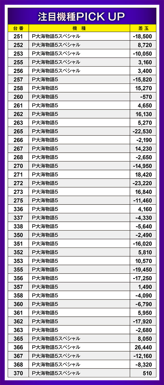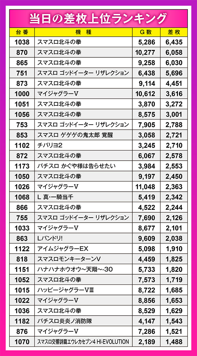 今回、ぱちタウン取材班の目を引き、最も存在感が際立っていたのは、やはり『スマスロ北斗の拳』。設置の半数以上の台が1,000枚を上回っていた上、この日の差枚TOP3を独占するなど、やりたい放題だった。またパチンココーナーでは『大海』シリーズ2機種が、こちらも相変わらずの結果を産み落としていた!次回も『北斗』&『大海』の動向には注視しておいた方がいい…?