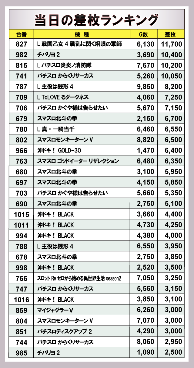 『L戦国乙女4 戦乱に閃く炯眼の軍師』『チバリヨ2』『Lパチスロ炎炎ノ消防隊』『パチスロ からくりサーカス』の4台から万枚OVERが飛び出し、大きな熱量が確認できた。店内には大台突破台が多数生まれており、各所で打ちごたえのある状況が整っていたことが窺える。