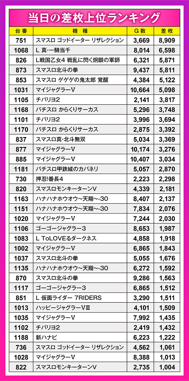9,000枚に迫る好記録で、この日の最高差枚記録となったのは『スマスロ ゴッドイーター リザレクション』。次いで増台されたばかりの『L 新・一騎当千』が2位にランクインする結果となった。また、前回1~3位を独占した『スマスロ北斗の拳』からも4位入賞台が出現し、健在ぶりを披露!