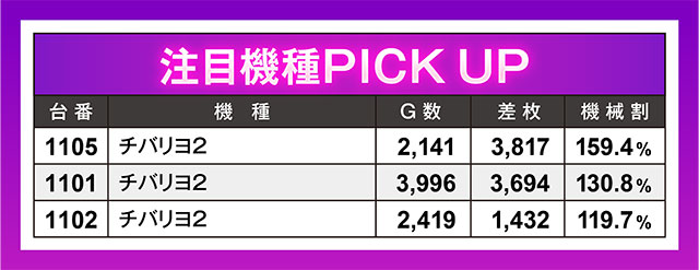 4台設置の『チバリヨ2』は3台がプラス、それも3台ともが1,400枚オーバーという文句なしの結果に。特に1105番台&1101番台は3,500枚を上回る差枚となっており、もしもっとガッツリ回されていたら、さらなる差枚を積み重ねていたことが容易に想像できた。