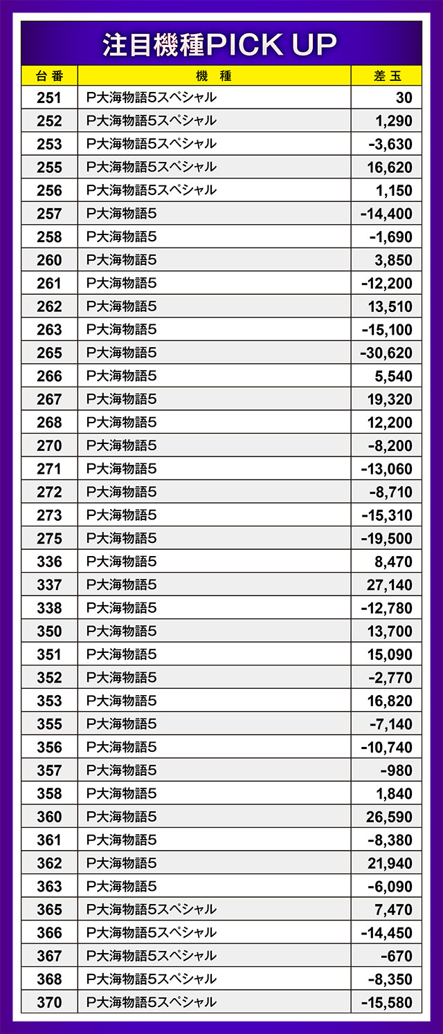 前回11月11日と同じく、今回も『P大海物語5』と『P大海物語5スペシャル』が並ぶブロックの差玉状況を調査!するとやはり盛り上がっているのはもちろんのこと、プラス差玉が大量に生まれていることが判明した。40台中、約半数の18台がプラっていたばかりか、さらにそのうちの半数以上である10台が10,000玉を上回っていた!