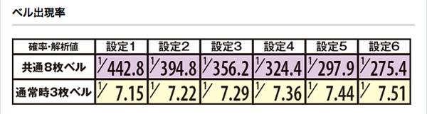 高設定ほど共通8枚ベル確率が高い。比較的、共通8枚ベルの成立を見抜きやすいボーナス中とボーナス準備中にカウントし、参考材料として活用したい。