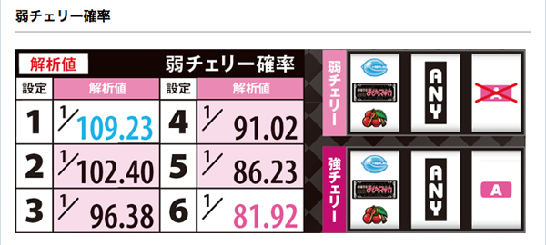小役確率のなかで、設定差が設けられているのは弱チェリーの確率。サンプル数を増やし、設定推測に活用したい。
