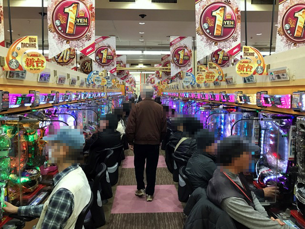 1円パチンコ、5円パチスロの低貸しコーナーも人気。特に1円パチンコの稼働率は高く、スペックを問わず様々な機種が活気づいていた。