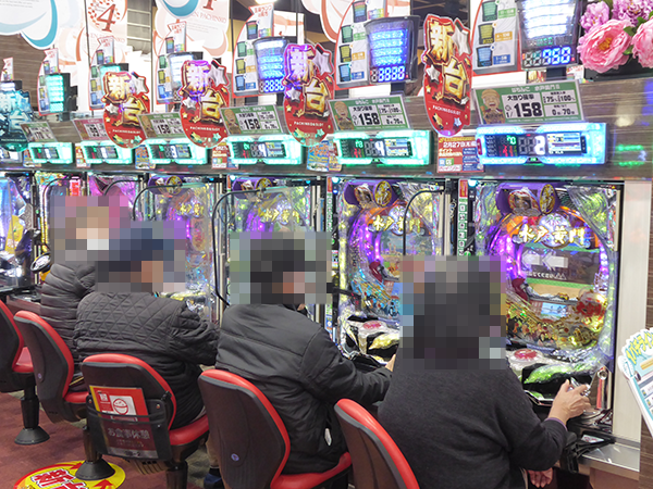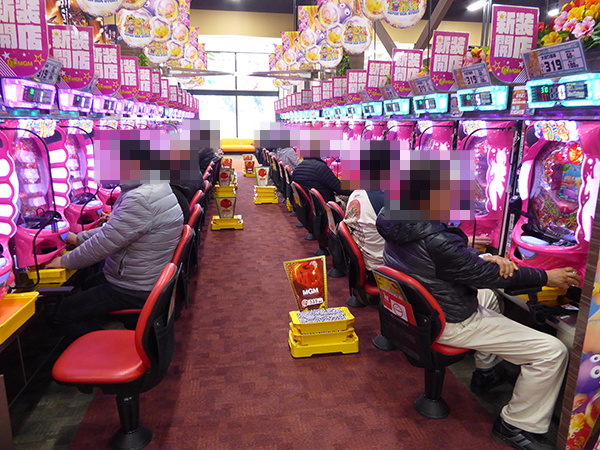 お昼を過ぎた頃の4円パチンコをみてみると、「ぱちんこCR北斗の拳6 天翔百裂」や「CRスーパー海物語IN沖縄4」が大にぎわい。明るい笑みを浮かべるといった姿が多く、各シマから華やかな雰囲気も感じられた。