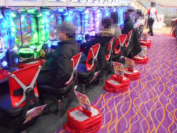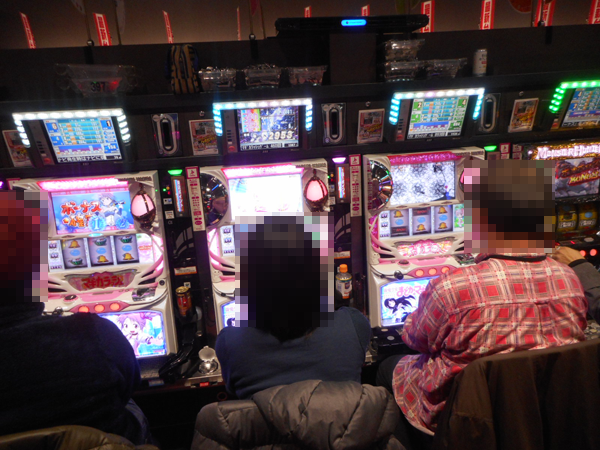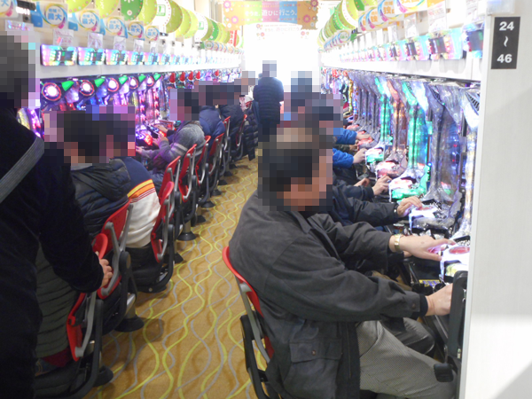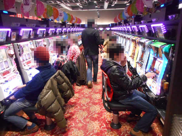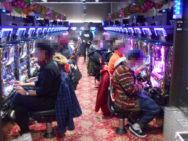 入場するプレイヤーを見ていくと、2階のパチスロコーナーへ向かう姿が目についた。目的は新台の「パチスロ アラジンAⅡ」のようで、開店直後から満席となっていた。そのほか、ハナハナシリーズや「SLOT魔法少女まどか☆マギカ」、「サラリーマン金太郎 出世回胴編」などにも空き台はほとんど見られない。