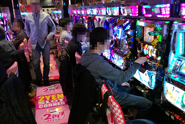 盛況な2円パチスロコーナーでは、若年層から中高年層まで幅広いプレイヤーがもくもくと遊技に打ち込む姿があった。