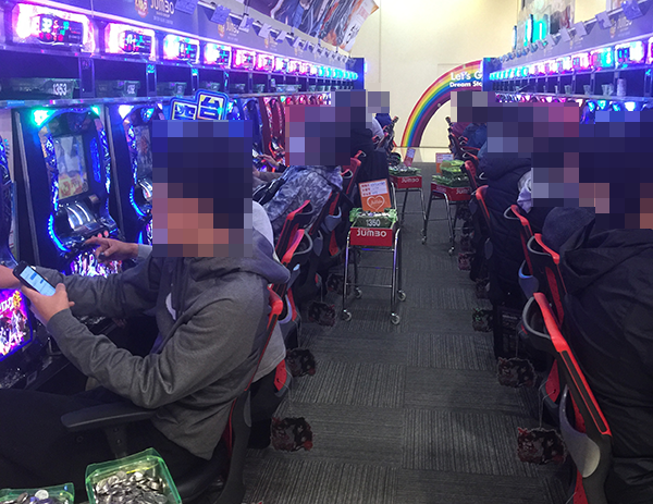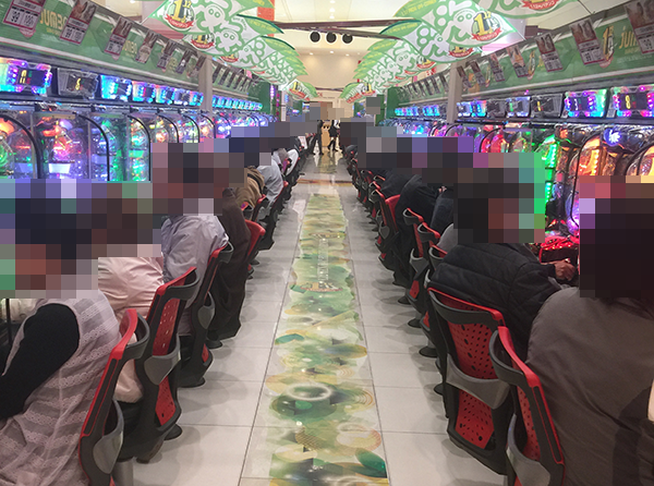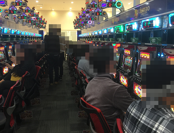 大勢のプレイヤーでにぎわう店内は、パチンコ、パチスロともに華やかな雰囲気に包まれていた。