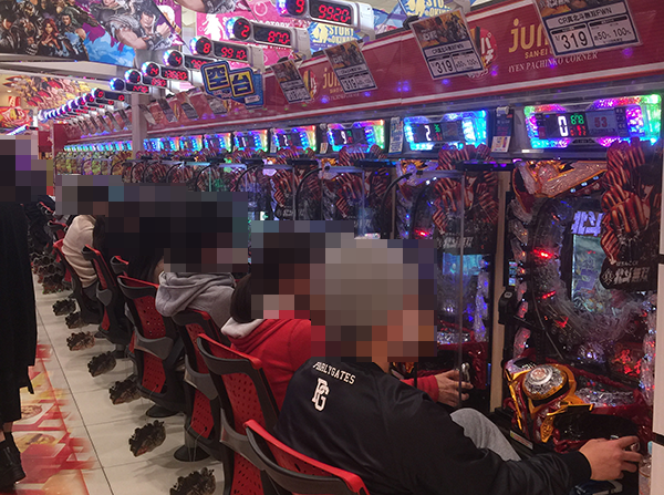 14時すぎのパチスロの状況をうかがうと、「バジリスク~甲賀忍法帖~絆」や「パチスロ北斗の拳 転生の章」などが盛り上がっていた。