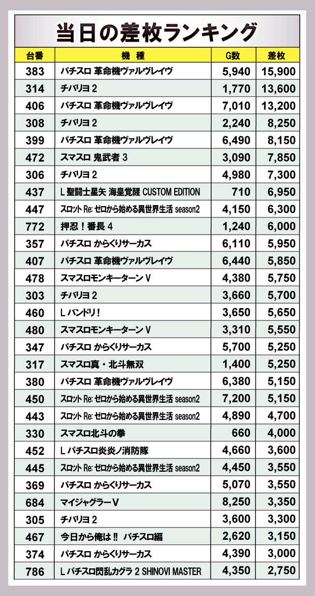 『パチスロ 革命機ヴァルヴレイヴ』『チバリヨ2』から万枚OVERが発生し、当日の店内の盛り上がりを牽引する存在となっていた。この他にも大台突破台が多数生まれており、TOP30の台は+2,000枚OVERから名を連ねている点も、同店の高い実力を証明していると言える。