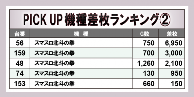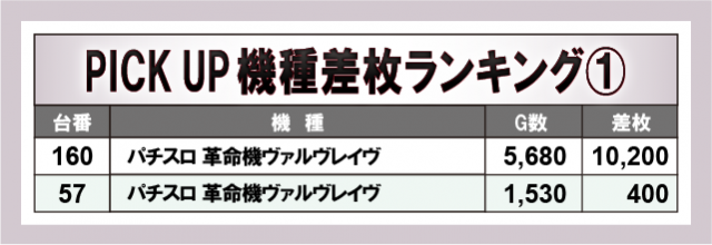機種単位での活躍を見ると、『パチスロ 革命機ヴァルヴレイヴ』『スマスロ北斗の拳』『マイジャグラーⅤ』の3機種が好感触を掴んでいたようだ。全体的にプラス差枚台の割合が高くなっており、ファンはすぐに手ごたえを感じては時間の許す限りレバーを叩いていた様子が窺える。
