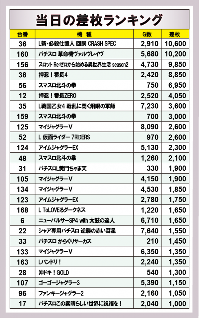 ※差枚数順に掲載しています。