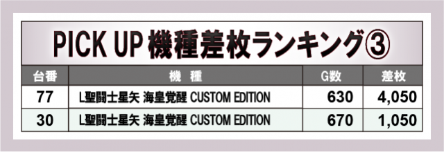 上表のスマスロ3機種でまとまった出玉を獲得しており、『スマスロモンキーターンV』『L聖闘士星矢 海皇覚醒 CUSTOM EDITION』に関しては、全台プラス差枚を記録。ゲーム数の物足りなさは感じられるものの、いずれの台もコンスタントに大当りを積み重ね、これらの機種が当日の盛り上がりを牽引していたのは間違いなさそうだ。