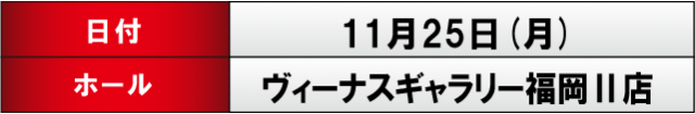 11月25日、『ヴィーナスギャラリー福岡Ⅱ店』にて「キングフッキー君 独占取材」が実施された。コンスタントな実施で期待感と開店前の緊張感が渦巻き、大盛り上がりとなる1日を予感させる空気がヒシヒシと伝わってきたが、果たしてどのような展開を繰り広げたのか…さっそく詳細データとともに、当日の内容をお伝えしていくぞ!