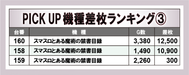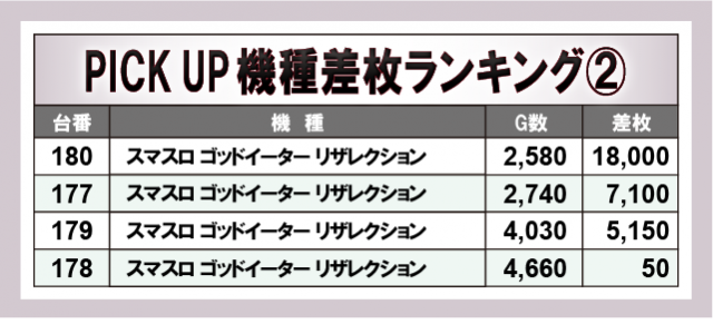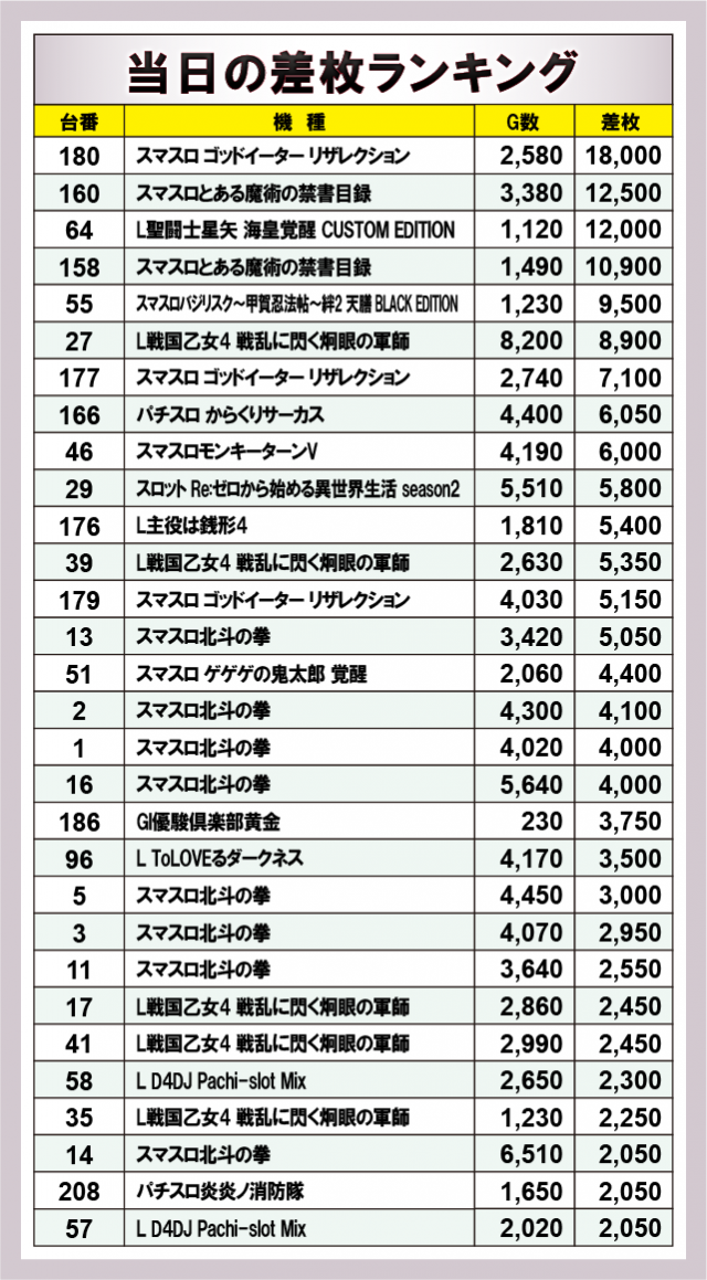 上表の5機種はスマスロを中心にまとまった出玉を獲得しており、しっかりとポテンシャルを解放していた様子が窺える。なかでも『スマスロ ゴッドイーター リザレクション』『スマスロとある魔術の禁書目録』では全台プラス差枚をマークし、高い活気と熱気に満ちていたのが印象的だ。