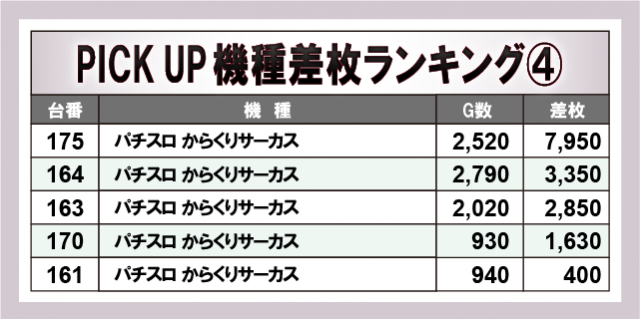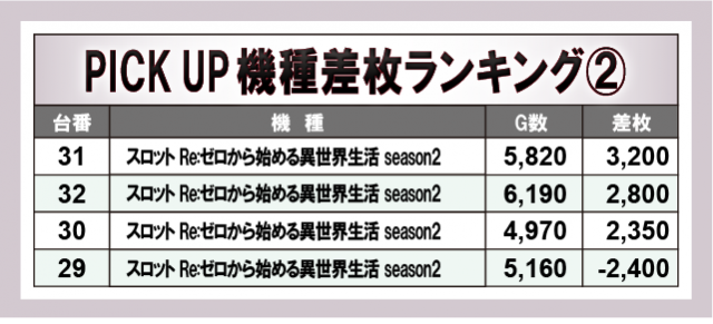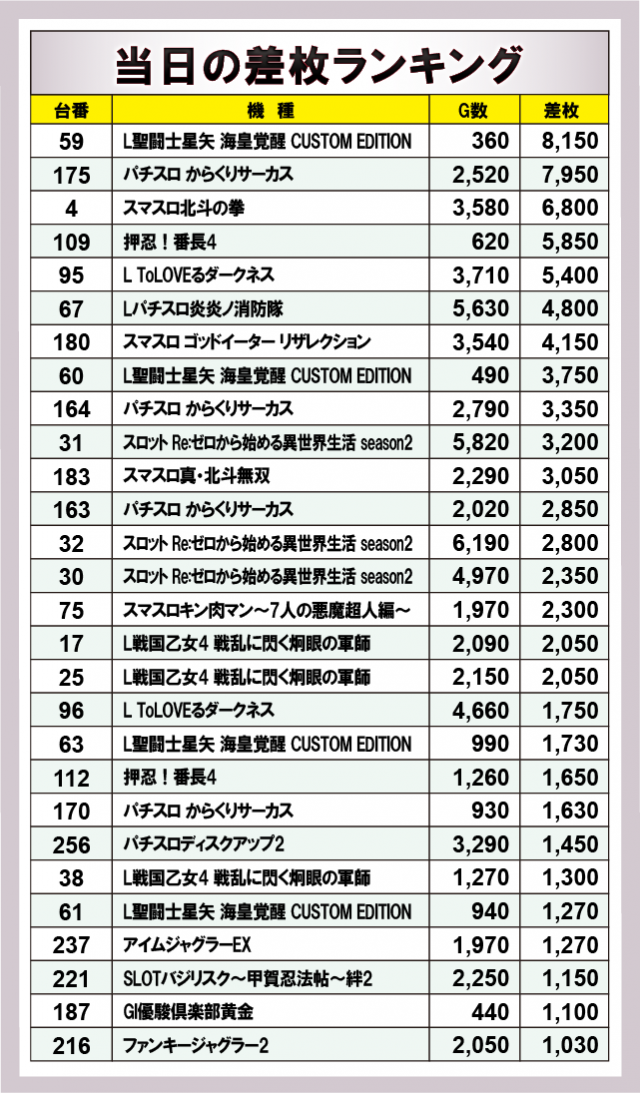 上表の『L聖闘士星矢 海皇覚醒 CUSTOM EDITION』『スロット Re:ゼロから始める異世界生活 season2』『L ToLOVEるダークネス』『パチスロ からくりサーカス』は、いずれも店内に熱気を形成した機種と言える。4桁プラス台が多く出現し、打ちごたえのある状況が整っていた様子から、ファンにとって叩き甲斐があったと言えるだろう。