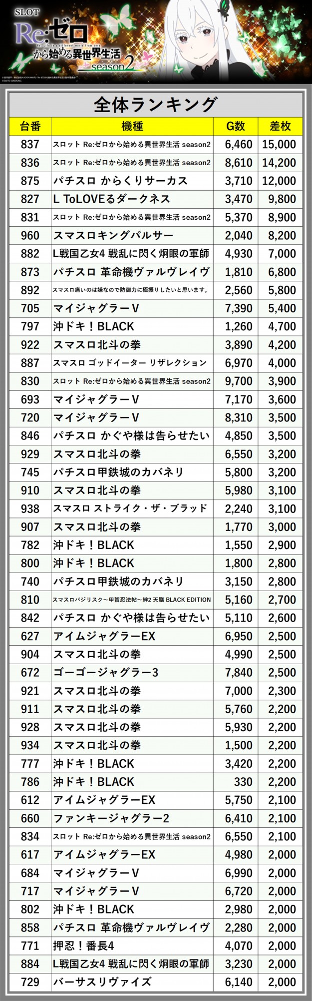 厳選された取材対象機種をはじめ、その他スロット全体から好記録が飛び出した!プレイヤーが楽しんだ1日を下記データにて振り返ってみて欲しい。