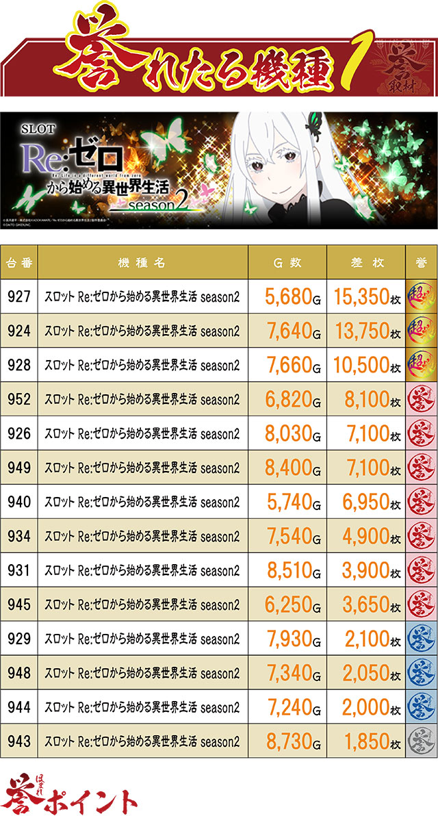 全28台が導入済みの『スロット Re:ゼロから始める異世界生活 season2』。そのうちの半数を超える17台がプラっていたばかりか、14台が誉マークに。さらにさらに3台が10,000枚オーバーという、規格外の結果に…!