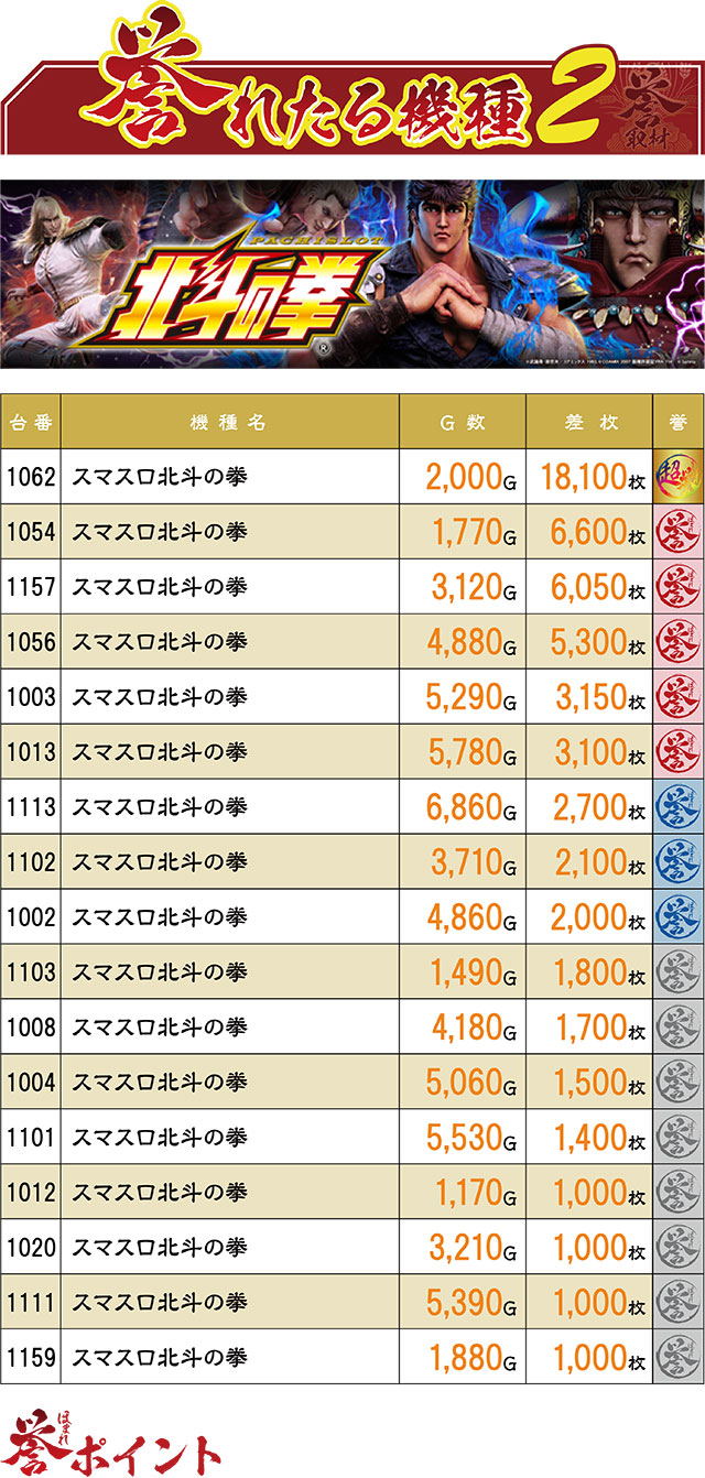 『スマスロ北斗の拳』からも大量の誉マークが誕生!その台数、実に17台。コンプリートした1062番台をはじめ、優秀台挙動を見せた台が多かったようだ。